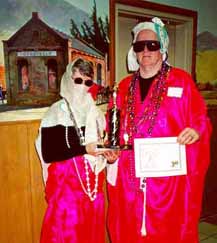 The going got tough with the real oldtimers: Seventy-year-old Jo-Jo the clown (with an inside track since he donated some door prizes) beat out the inner-tube-wearing sailor clowns for first trophy. First place in "open bands" went to the 70-something year-old hot mamas second-line dancers and dixieland band "Monterey Hot Jazzers". We were crushed, but with tears in our eyes, dainty or virile (as appropriate) in our day-glo fuchsia outfits, Lawrence of Disarraybia and the Princess went forward to accept a glamorous SECOND place trophy for LTWCMB for "open bands" (is this as in "open and affirming"?). One group asked if ALL LTWCMB dressed as us, another asked if Lawrence was in the Gay Ku Klux Klan, but no matter...