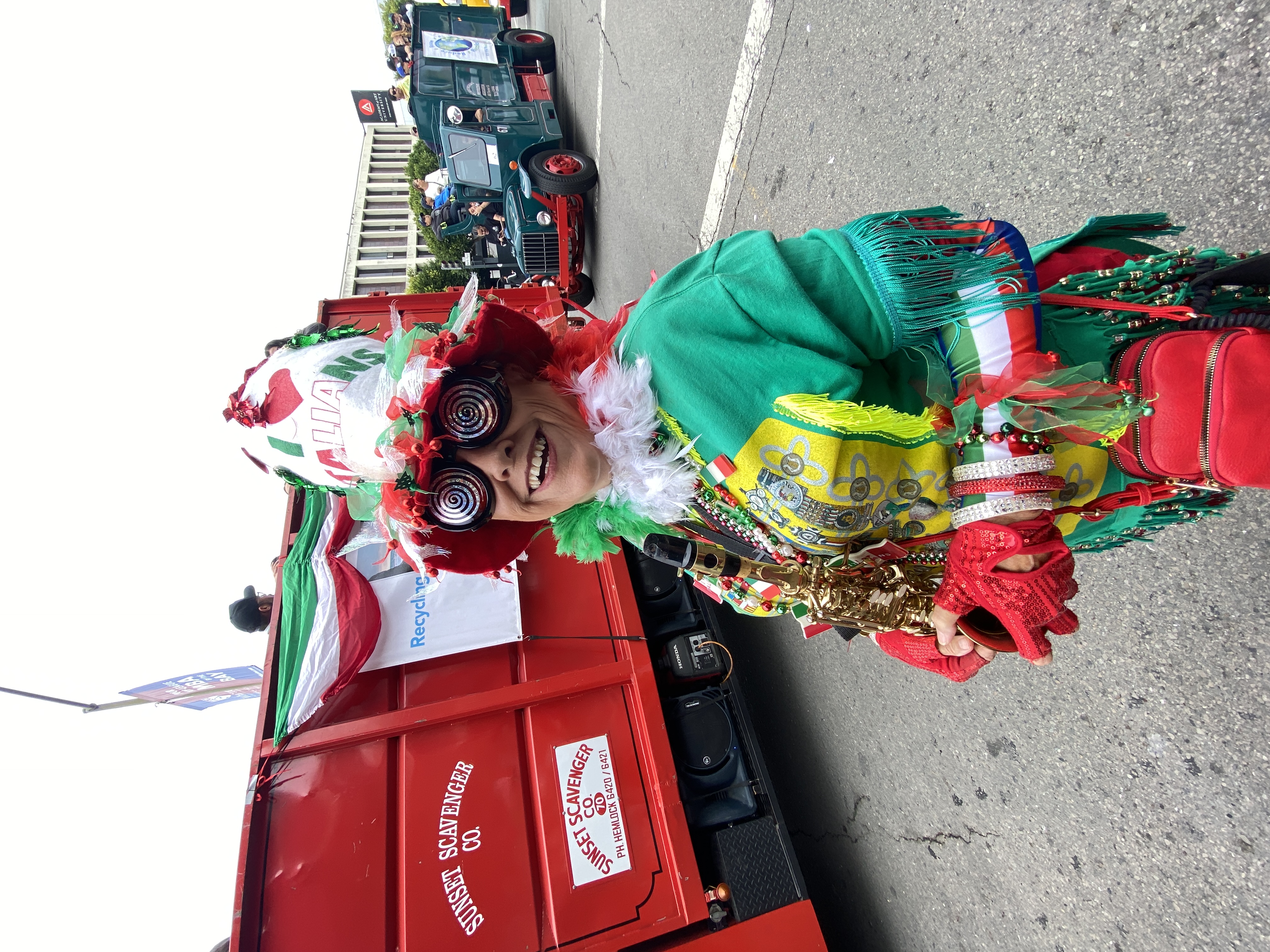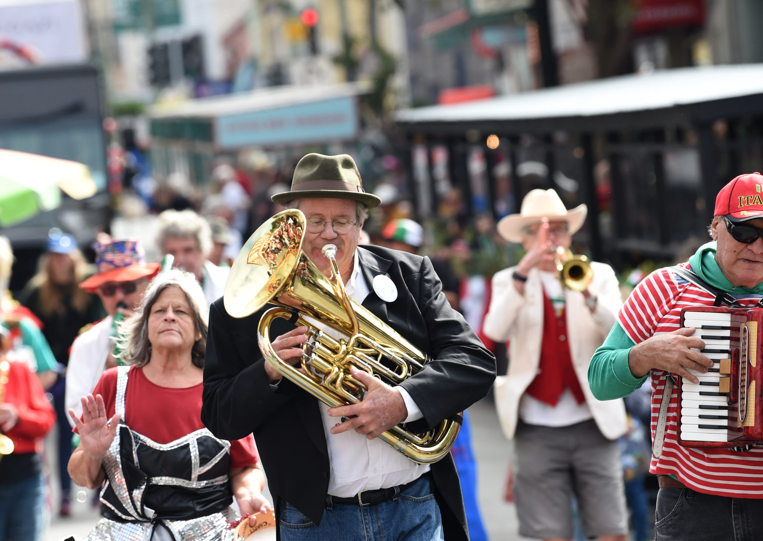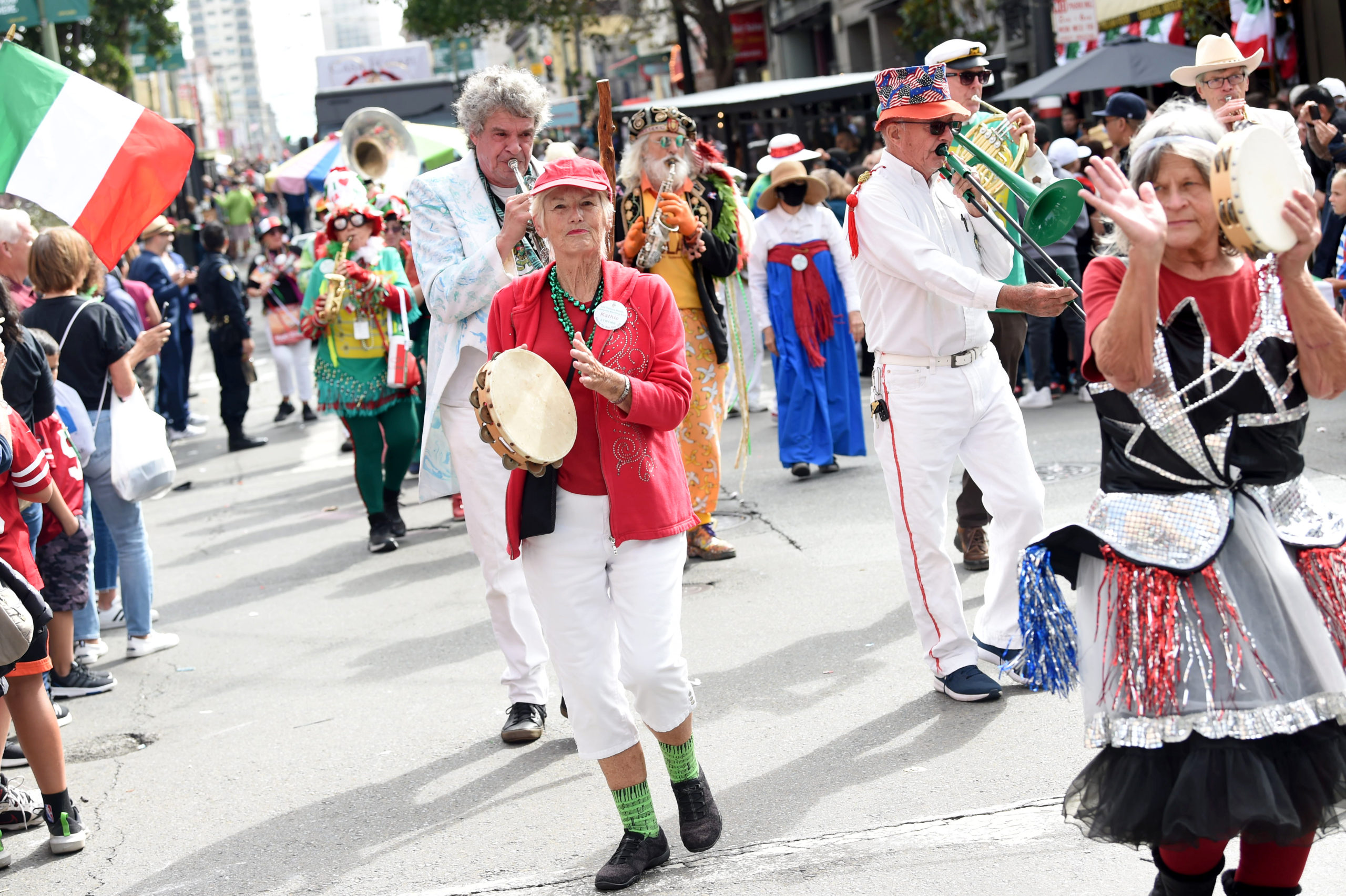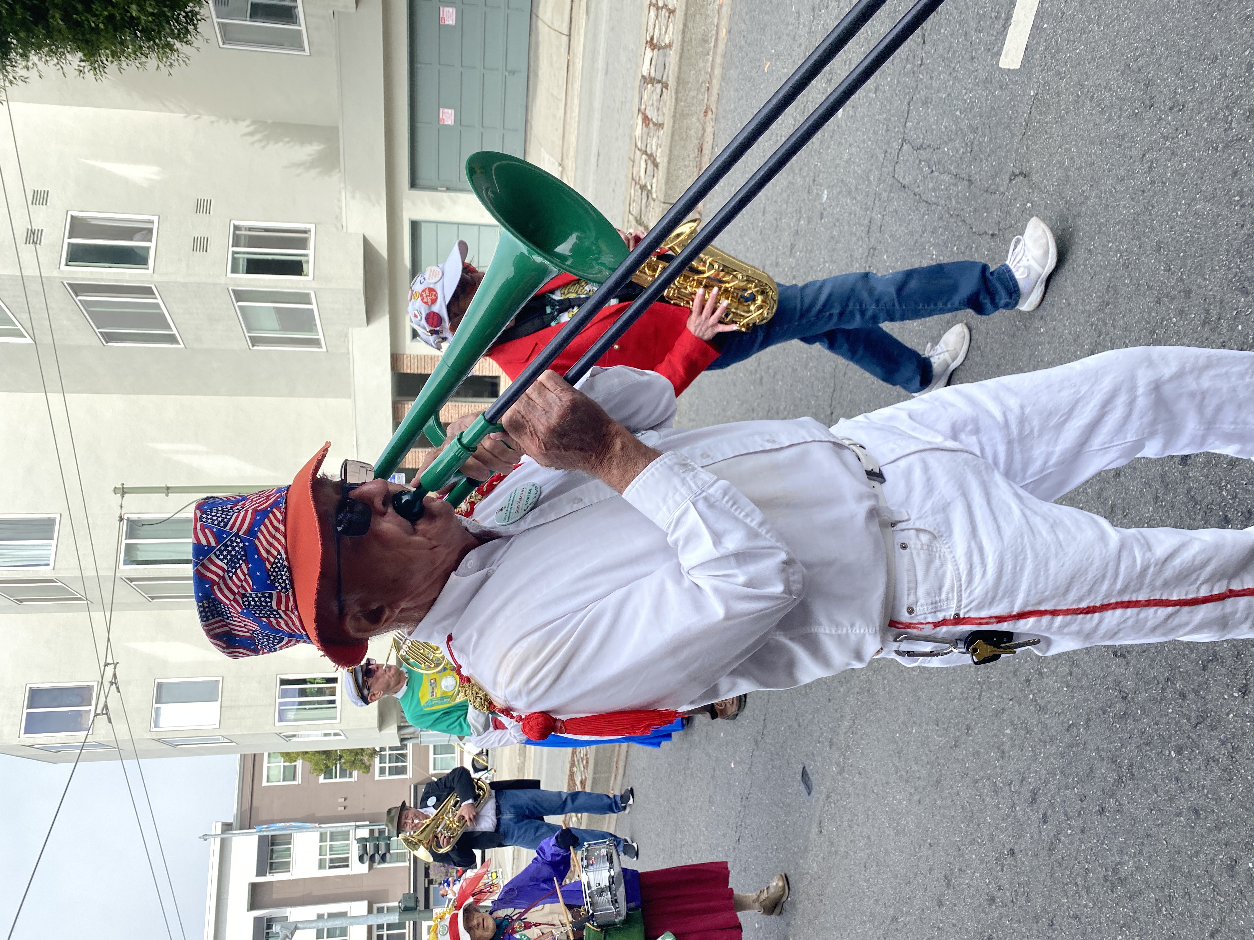 The Italian Heritage Parade (Columbus Day) was back to its full glory this year! We had a good band turnout, and we were well received by the thousands of spectators. The Blue Angels flying overhead were obscured, however, by a fast-moving fog layer which created occasional gusts of wind at street level. |