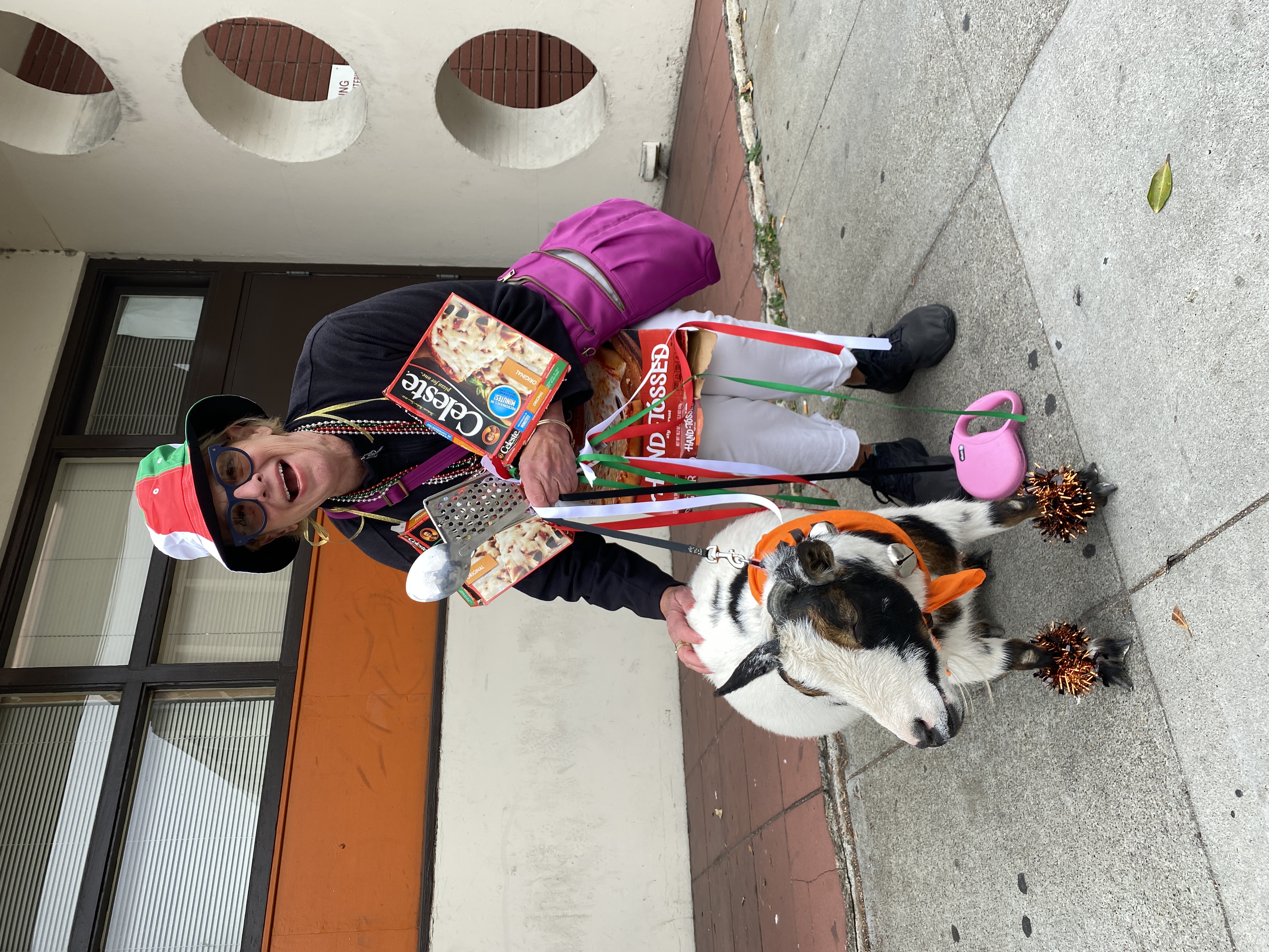 [8] The rest of the photos were sent in by Judi. The first few were taken in our staging area, before the parade. Here, she is befriending a goat, who mistakenly thought it was a pet parade.