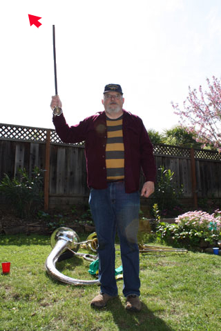 ATTENTION! Something is going to happen when I drop the stick down as shown in the next photo (Start the song, sing, end the song and go to cadence, etc.) May also have a whistle to get your attention, but not always.