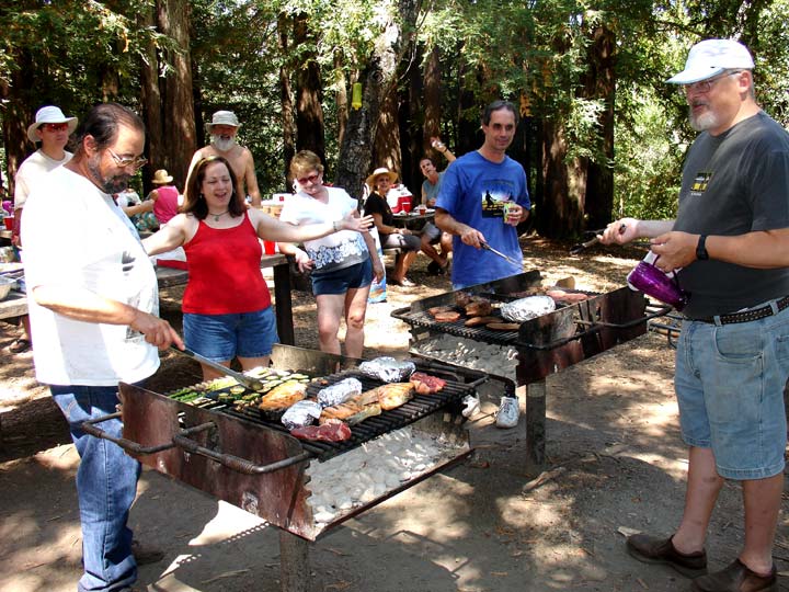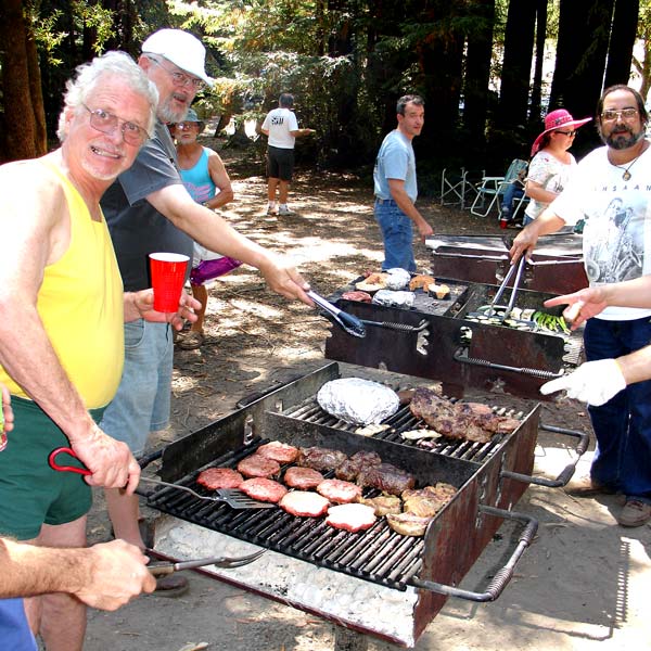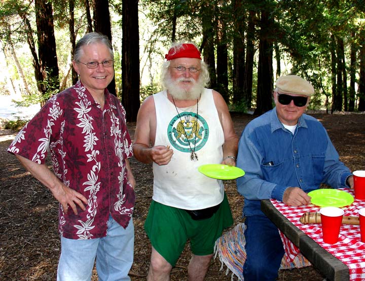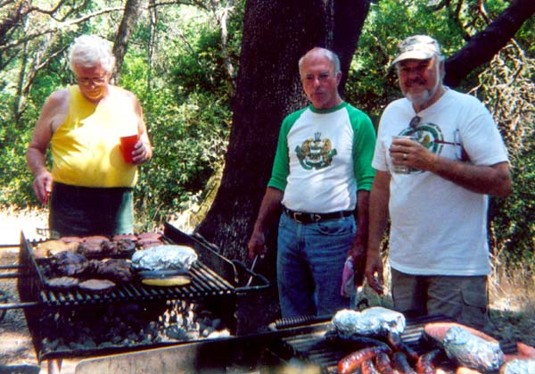 Joey, Steve Slide Slusser, Bob McIntyre, and Ross warm up before the barbecue.
